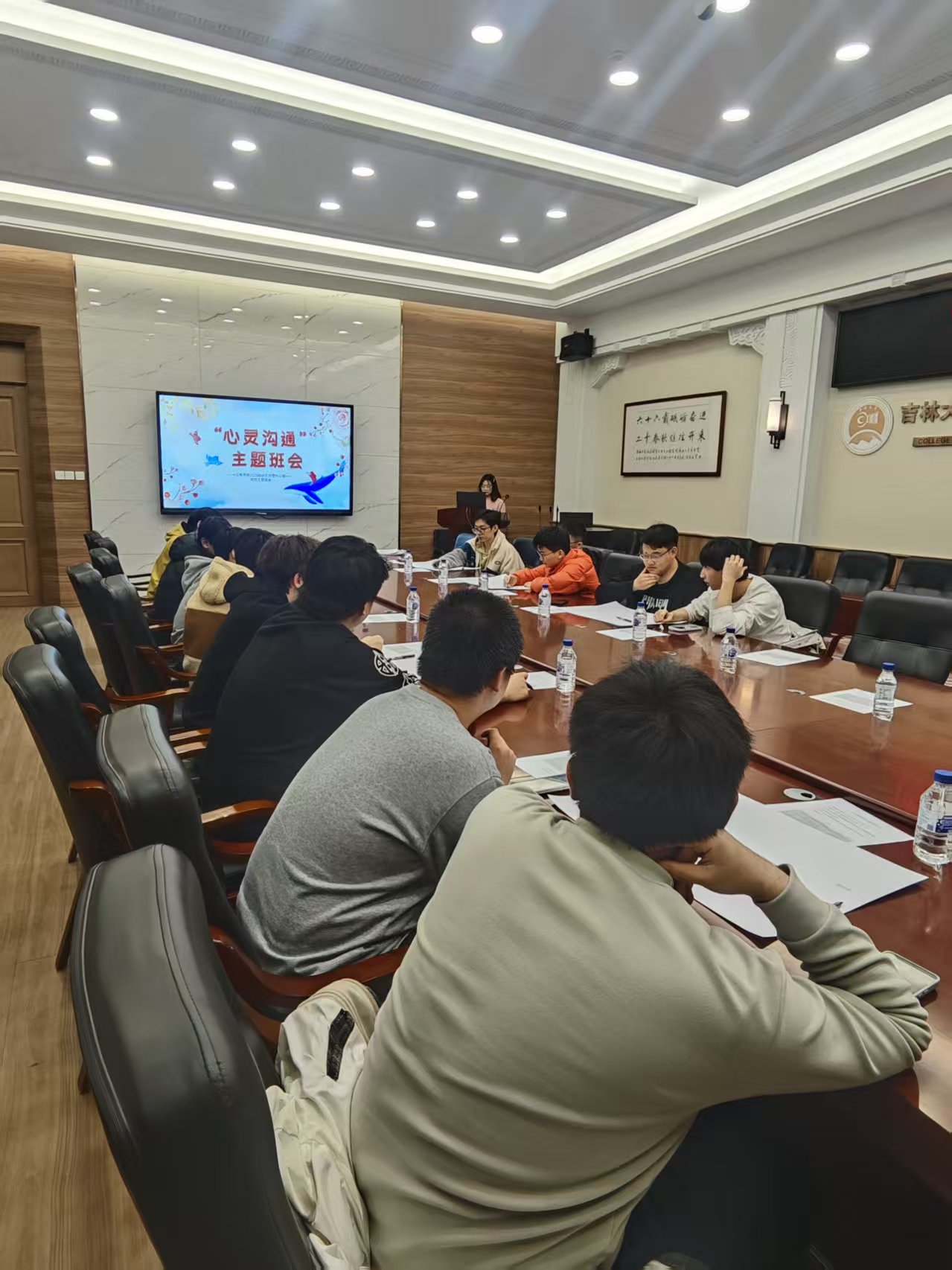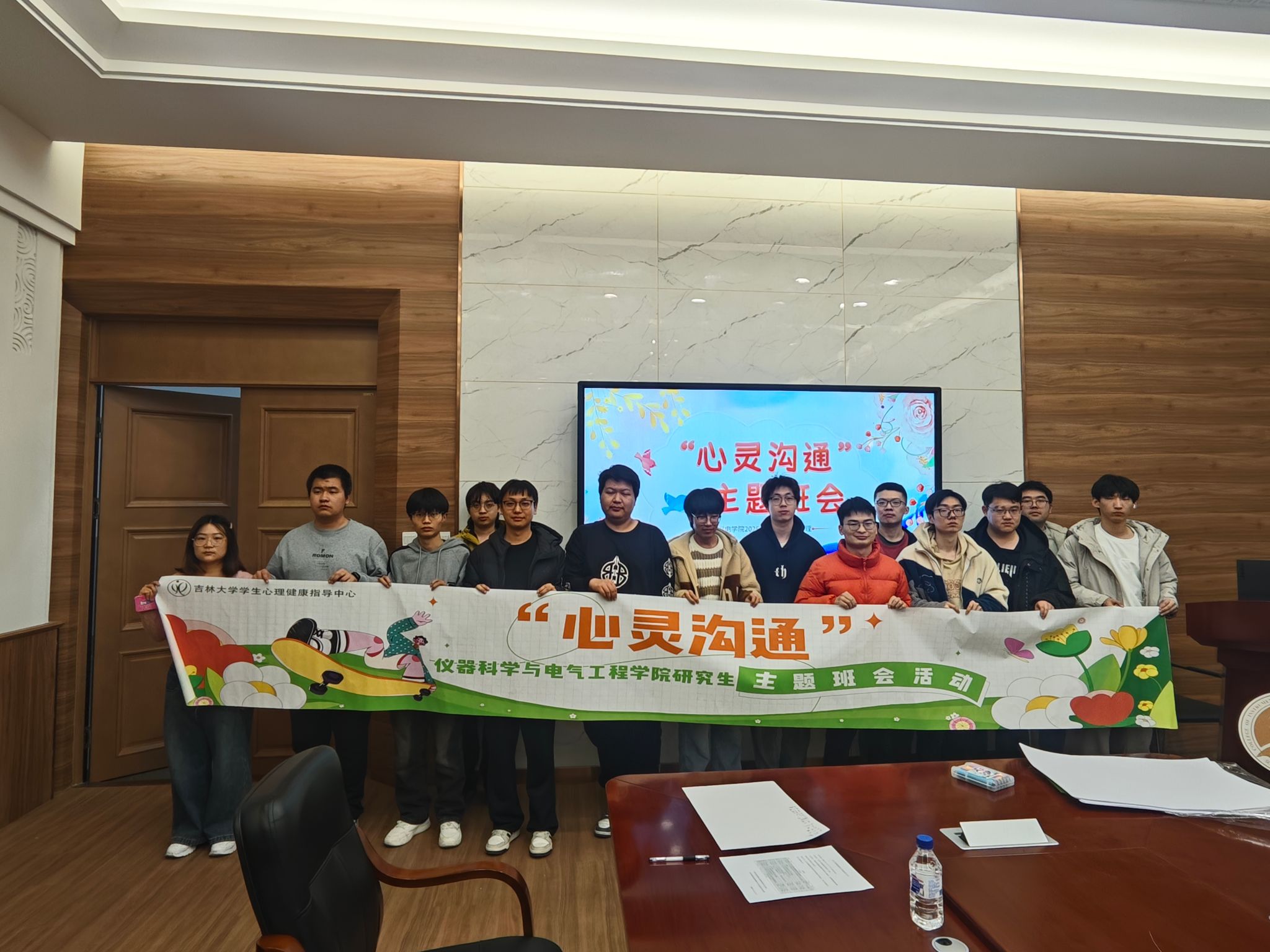 班会最后,同学们写下本次活动的收获与感悟,彼此分享。带领者在总结环节寄语全体同学:心理韧性不是与生俱来的,而是在一次次面对困境的过程中培养出来的;要允许自己有脆弱的时刻,更要学会在脆弱中寻找力量,不苛责自己的不足,关注每一次的成长。同时,带领者提醒同学们,若出现情绪持续低落、对曾热爱的事物失去兴趣或身体出现自控反应等心理预警信号,可通过“JLU吉大心声”微信公众平台预约心理咨询,学校心理健康指导中心始终与大家同行。班会在全体成员的温馨合影中圆满落幕。