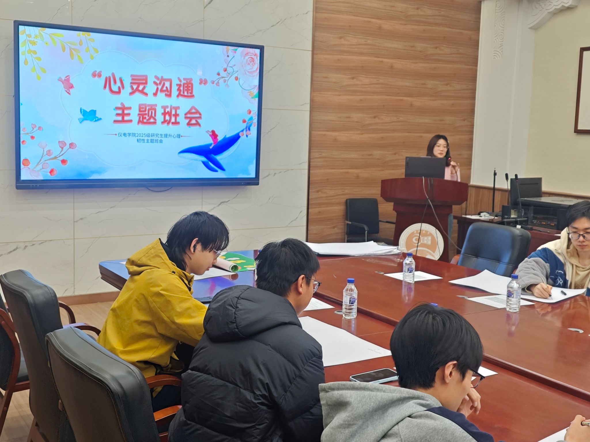 研究生新学期心灵沟通主题班会4月2日在朝阳校区地质宫330顺利召开。本次班会以“提升韧性”为主题,由朋辈心理辅导员马婧涵主持,2025级硕士班长郝金赫协助完成,学院兼职心理辅导员周琪老师和研究生代表参加活动。