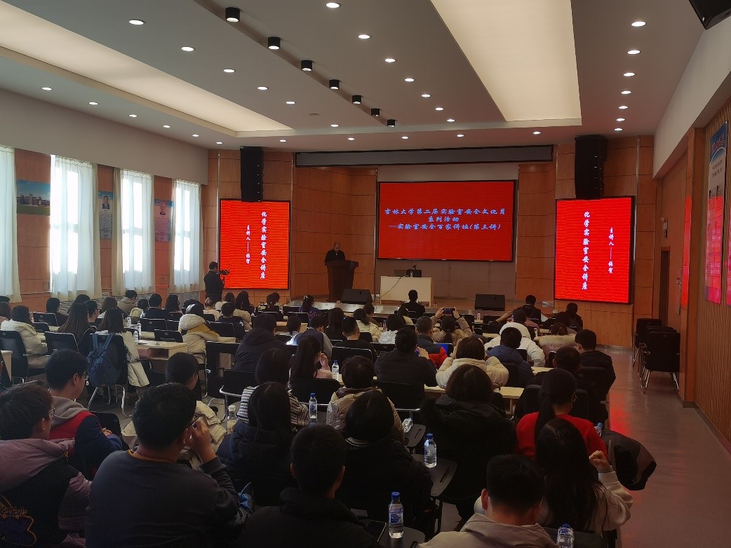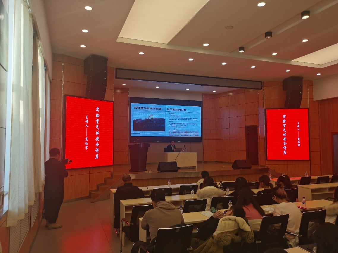 化学学院副院长张贺主讲,张贺结合多起由危险化学品引发事故的典型案例,深入分析了实验室用电、用火、危险化学试剂管理等方面可能存在的潜在危险,为参会师生树立了预防为主、未雨绸缪的指导思想。讲座第二部分由广州德标智能化工程有限公司的戴红军主讲,戴红军以《实验室气体安全讲座》为题,重点介绍了有毒气体、易燃易爆气体、惰性气体等可能造成的危害,并对高校实验室气体钢瓶的常见隐患进行了分析。讲座第三部分由长春奥狮环境监测有限公司的刘宇臣主讲,讲座内容包括电离辐射的类型、电离辐射的危害、电离辐射的防护等方面知识。
