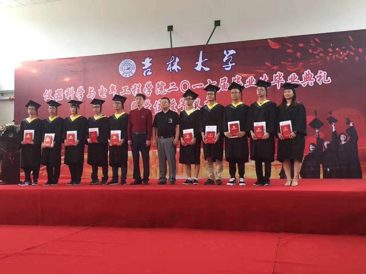 2017届博士与硕士毕业研究生名单,随后,刘长胜副院长宣读了2017届本科毕业生名单。院学位评定委员会主席林君教授与院长嵇艳鞠教授一起为所有2017届毕业生授予学位。接下来,院党委书记王爱民老师宣读了2017届校、院优秀毕业生名单,并为优秀毕业生颁发了获奖证书、合影留念。院教学委员会主任宣读了优秀毕业论文名单,并分别与测控系主任林婷婷教授、电气系副主任刘卫平教授为获得优秀毕业论文的同学颁发证书并合影留念。