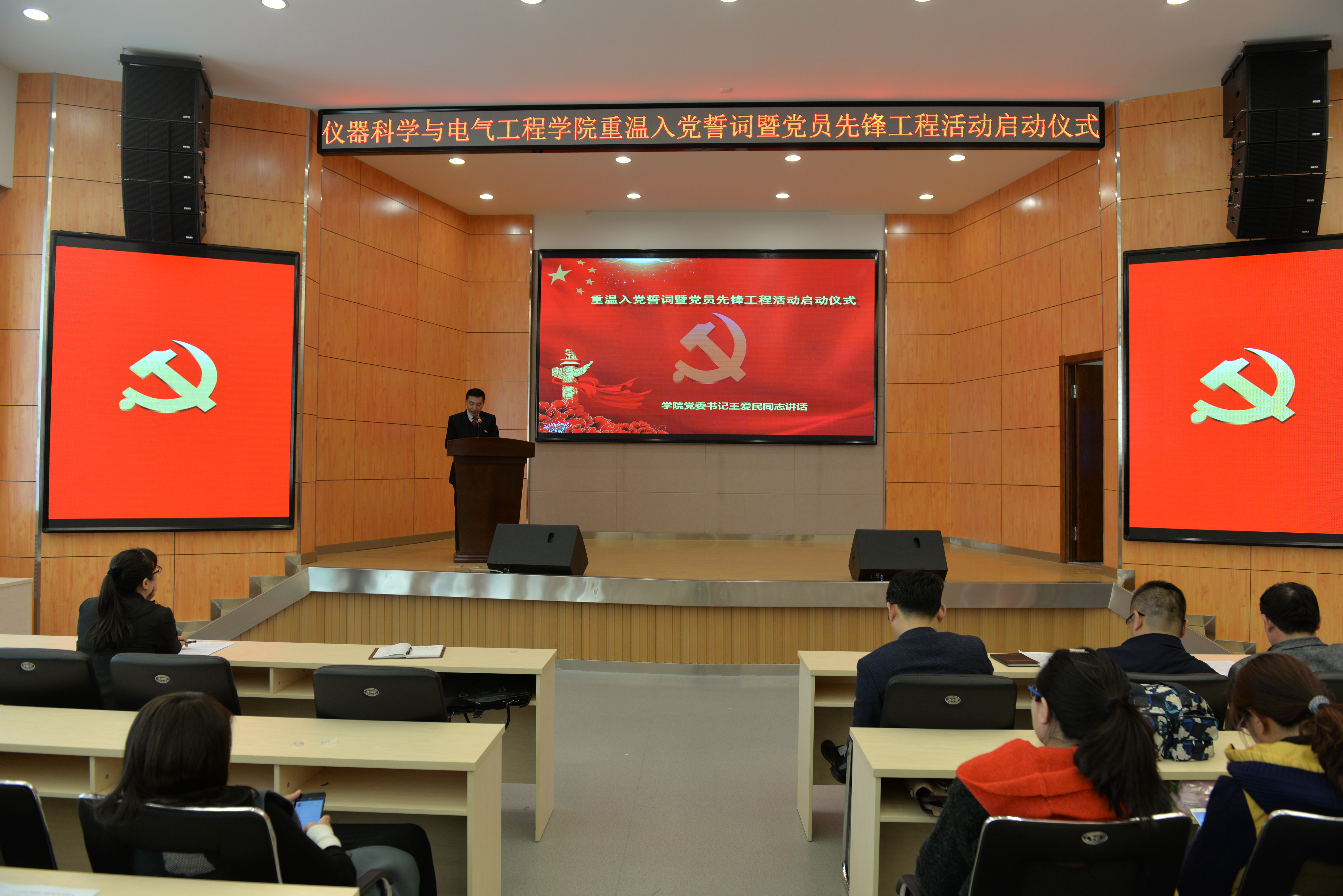 的发展历程,他以“勇争第一 永不放弃”概括了学院的发展史。并号召全院师生要把“勇争第一,永不放弃”作为仪电精神,发扬光大。接着,就深入推进党员先锋工程提出了明确要求,希望广大党员能够深刻理解先锋工程的重要意义,躬身践行先锋工程号召,对学院开展党员先锋工程提出三点意见:第一,统一思想,提高认识,深刻领会深入推进“共产党员先锋工程”的重要意义。第二,明确要求,强化管理,扎实有序深入推进“共产党员先锋工程”深入开展。第三,加强领导,完善机制,确保“共产党员先锋工程”创建活动取得实效。最后他强调,当前学院的事业站在了新的历史起点上,机遇和挑战并存,在这关键的发展时期,更需要我们的党员奋勇当先,不计荣辱,拼命苦干,争做先锋。战争年代共产党员高喊“跟我来”,今天我们要高喊“看我的”,希望全院党员以今天的启动仪式为契机,扎实推进“共产党员先锋工程”,真正做到“一名党员一份责任,一名党员一面旗帜”,不断提高学院党建水平,为促进学院各项事业的健康发展提供坚强的政治、思想和组织保证,以优异的成绩迎接党的十九大胜利召开!