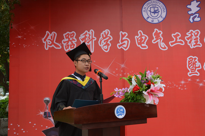 2014年度自强自立大学生标兵韩哲鑫同学分别作了发言。王应吉教授代表学院全体教师对2015届毕业生送上了最诚挚的祝福,希望大家在今后的事业中取得更大的成就。韩哲鑫同学代表学院全体毕业生向辛勤培养自己的母校,向仪电学院,向四年以来关心、帮助大家的领导和老师们表示了衷心的感谢和良好的祝愿。