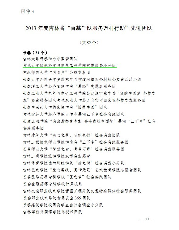在中共吉林省委宣传部、吉林省文明办、吉林省教育厅、共青团吉林省委、吉林省学生联合会联合下发的《关于表彰2013年吉林省大中专学生志愿者暑期“三下乡”社会实践活动暨“百基千队服务万村行动”先进集体和个人的决定》中,A片网站
