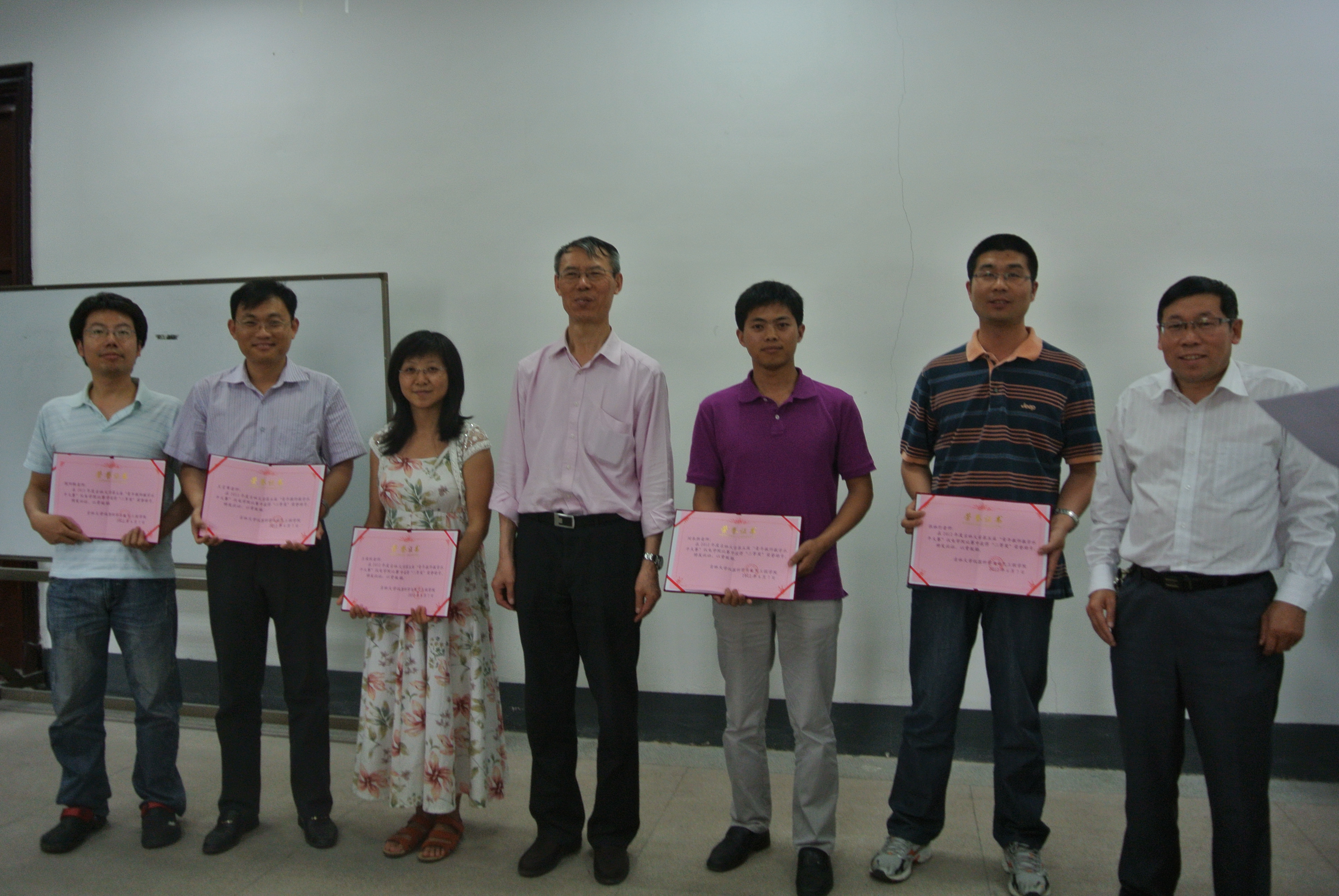 首先程德福副院长宣读学院对优秀班导师、青年教师教学大赛、青年教师双语大赛获奖人员的表彰决定,林君院长、余国友书记为获奖教师颁发荣誉证书,程院长在会上对2012年上半年教学工作进行总结,并对下周监考、评卷工作提出要求;余国友书记宣读学院对学生工作的奖励决定;陈祖斌副院长就2013年科技项目立项、申请工作进行说明;邱增凯副书记讲了近期毕业生工作的安排;房华副院长对放假前防火、防盗工作提出要求,对学院行政工作进行说明;最后林君院长对如何提高全院教师队伍业务能力,提升整体素质提出相关要求。