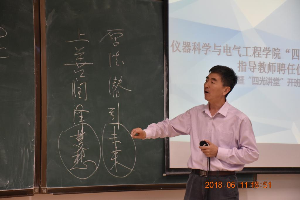 副院长刘长胜宣读了学院《关于聘任“四光讲堂” 学科前沿指导教师的决定》。院长嵇艳鞠、党委书记王爱民为于生宝等10名受聘指导老师颁发了聘书并合影留念。程德福教授代表聘任教师发表讲话,他鼓励学生打牢基础理论知识,呼吁创新培养方式,讲解了数字化、自动化、网络化、智能化理念并留下对学生的“上善润泽梦想,厚德潜引未来”的寄语,引起现场同学们共鸣,现场掌声不断。最后,党委书记王爱民总结讲话,他鼓励同学们要珍惜青年时代的美好时光,紧跟时代发展的步伐,并祝愿同学们心怀梦想,学有所获,学有所成,学有所用。同学们热烈的掌声中,学院党委副书记兼副院长周伟宣布本次聘任仪式圆满结束,并邀请嵇艳鞠院长为同学们进行“四光讲堂”的第一次授课。