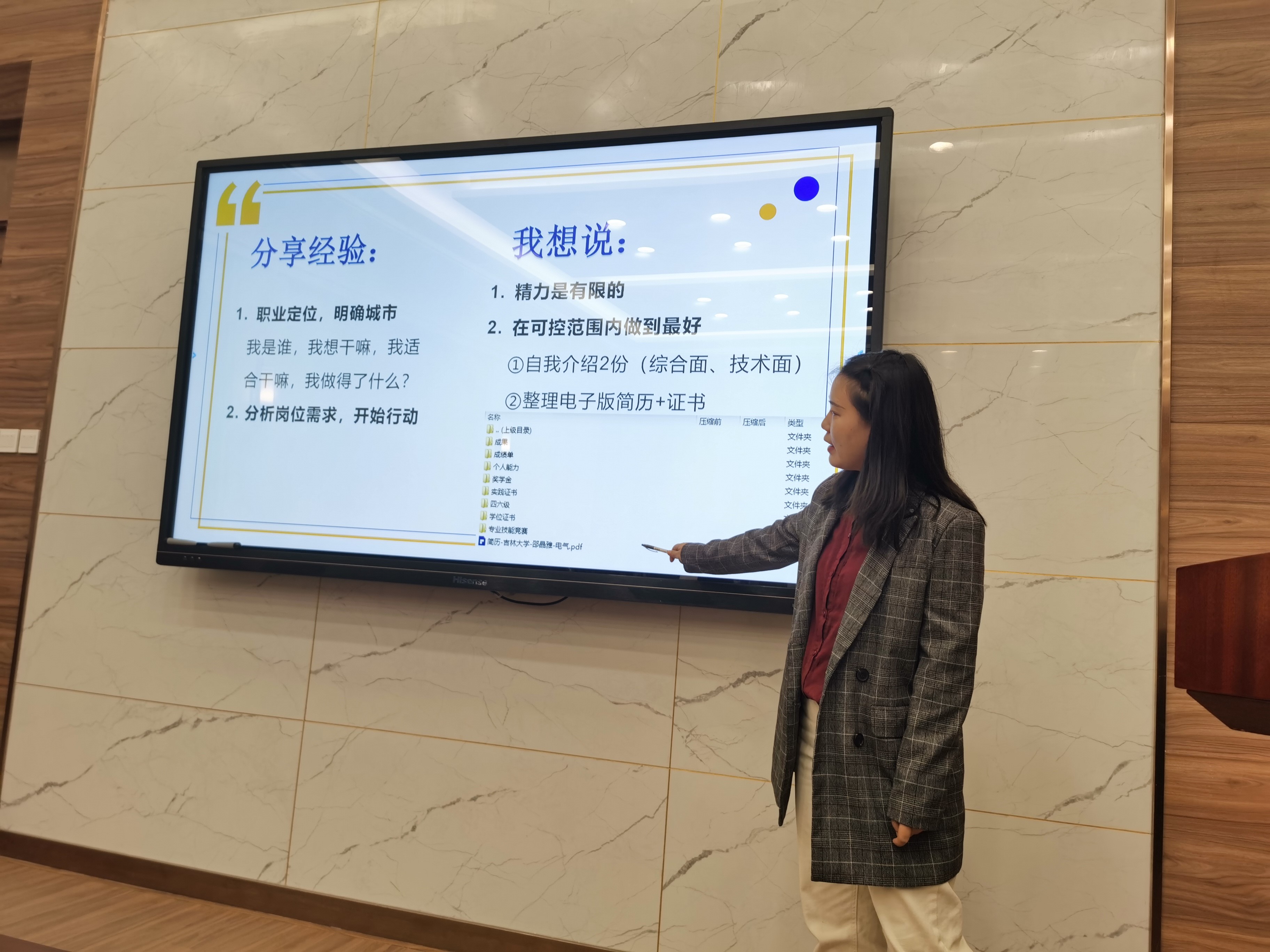 讲座伊始,主持人简明介绍了本次讲座的主题,提出了研究生做好自身规划对学术发展的重要影响,在大家的热烈的掌声中,本次交流会正式开始。受邀前来分享经验的5名同学在主持人的引导下依次上台讲话。吴燕琪博士分享了在奥胡斯大学的求学经历,并详细为大家讲解了在科研及出国留学的具体经验;邵晶雅为大家分享了自己疫情期间的学习经历,并为大家分享了如何关注求职信息、如何投递简历方面的经验;张春锋、刘乃嘉和张明维均结合自己的求职与科研经历,鼓励大家在参与科研项目时要深入了解其中的原理,并为大家分享了在面试、笔试环节的经验技巧。上台演讲的几位毕业生同学在会前都做了认真的准备,均准备了精心制作的PPT,他们丰富的经验满足了同学们的各种毕业打算,也丰富了同学们对未来的认知。会议最后,上台演讲的同学纷纷留下了自己的联系方式,告诉同学们如果有任何关于科研就业的问题都可以咨询他们。与会者们再一次用热烈的掌声表示着对他们的感谢和钦佩,相信本次交流会一定使与会者收益良多。