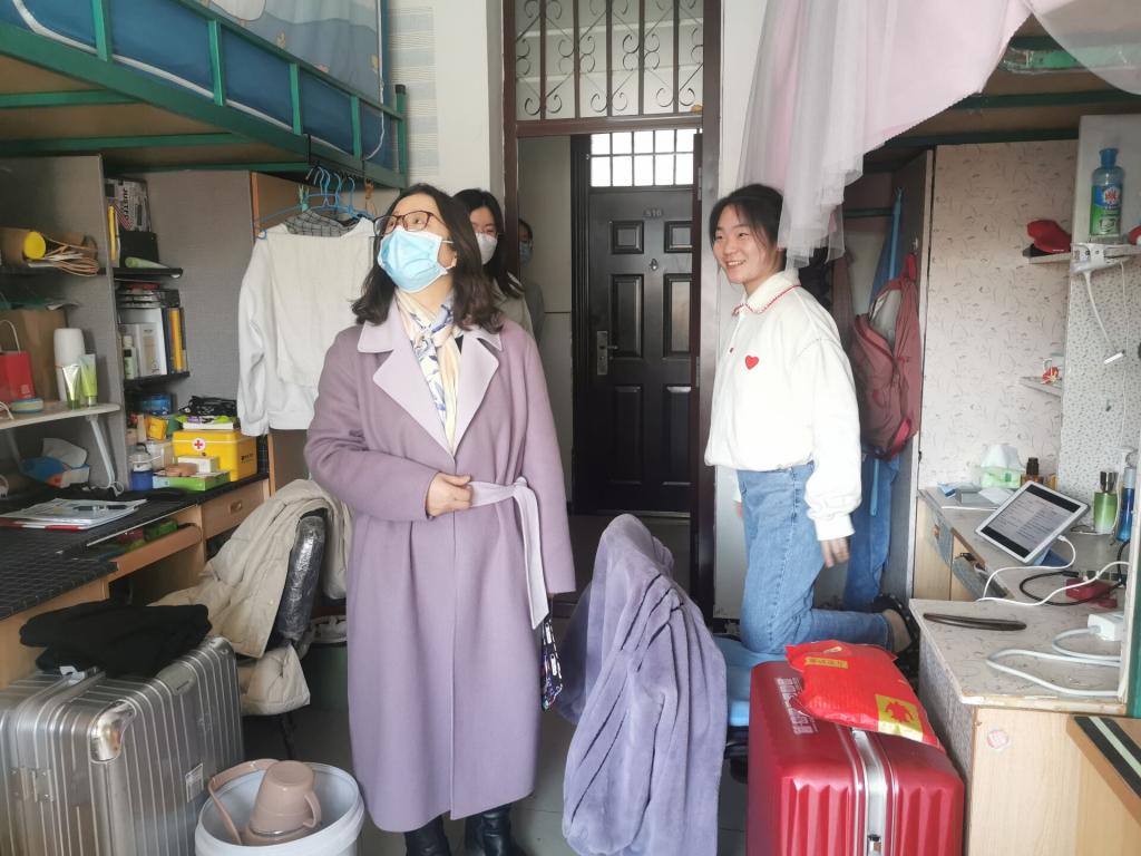 院长嵇艳鞠老师、学院党委副书记兼副院长周伟老师代表学院领导班子,走进朝阳校区一公寓和五公寓看望返校学生,学院团委副书记、2019级辅导员马姗姗老师随行走访。