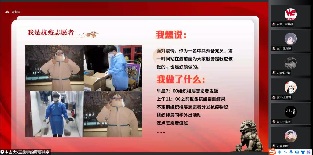 抗疫志愿者代表分享广大师生在抗疫过程中的先进事迹和宝贵经验。郝毅、王鑫宇、赵梦珂、胡玮桐同学分别从个人和集体两个角度出发,分享了在校园封闭管理期间的抗疫日记和志愿服务经历,吉大学子守望相助、封校不停学,学生党员积极投身防疫一线,践行着新时代青年的初心与使命。听完A片网站