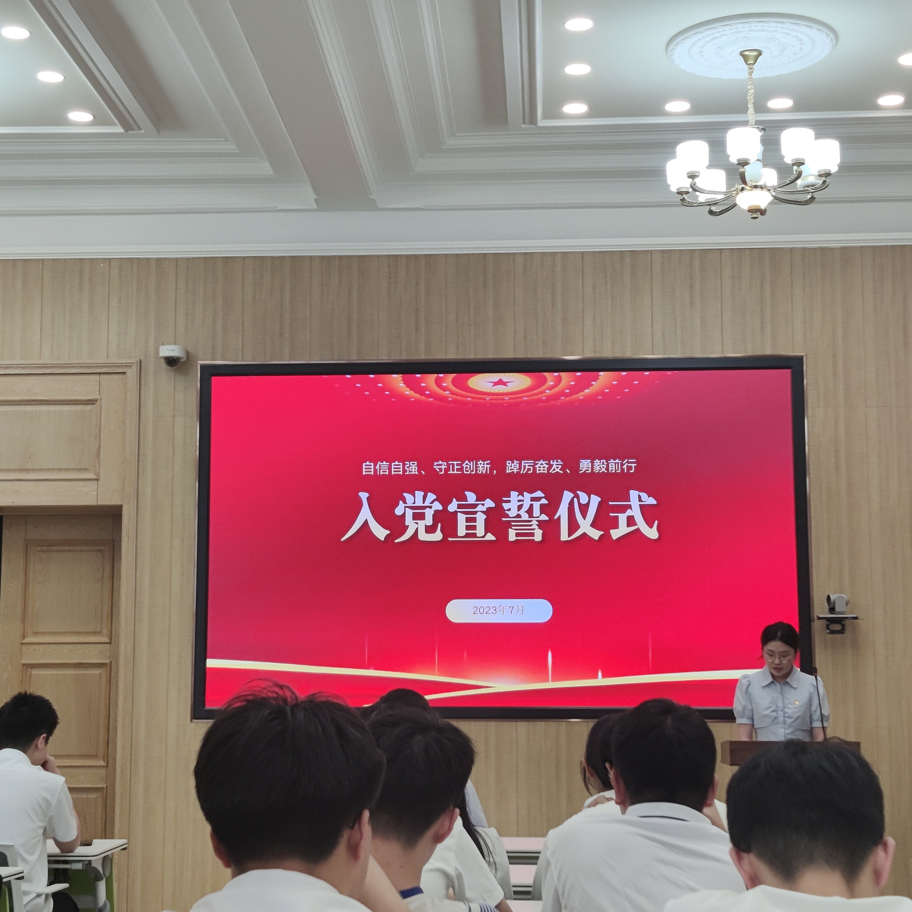 仪式上,全体师生党员共唱《国际歌》,在歌声中感受前辈的革命热情,用歌声展现青年的热血风貌。上级党组织代表周伟为13名新发展党员佩戴党徽,当庄严的党徽戴在胸前的一刻,全体党员的自豪感和荣誉感油然而生,肩上更多了一份沉甸甸的责任。