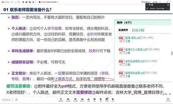 分享环节中,学长学姐结合自身升学经历,多维度梳理保研直博关键要点。内容包括联系导师的文书撰写、院校硬性要求解读、保研材料整理、夏令营申请的时间规划与信息获取,以及直博利弊分析、本校直博政策解读、面试准备与导师选择策略等。同时,针对保研边缘学生提供了成绩稳定与材料准备的双重建议,并分享了英文面试表达、院校冲刺保底规划等实用技巧,将升学经验倾囊相授。