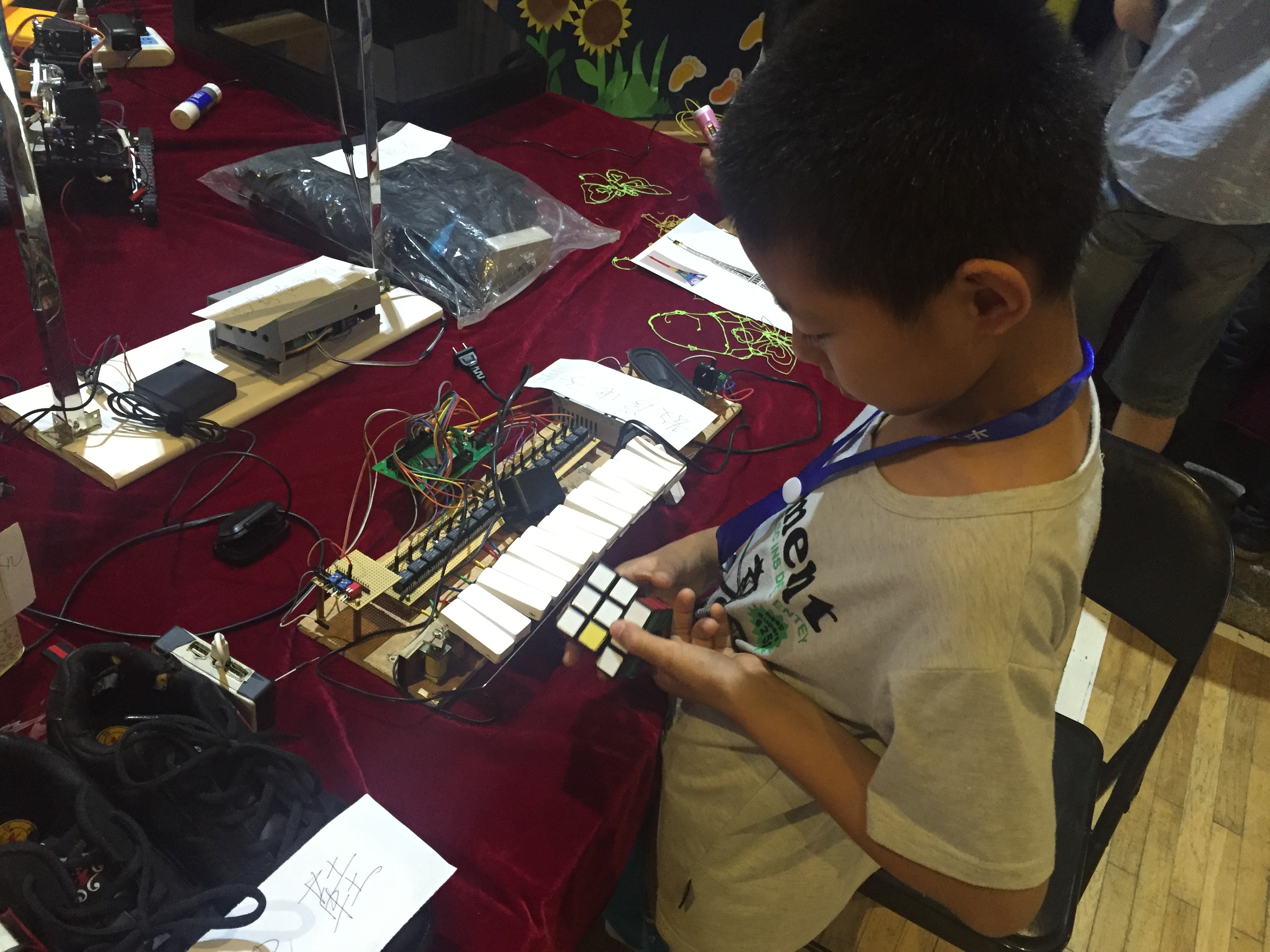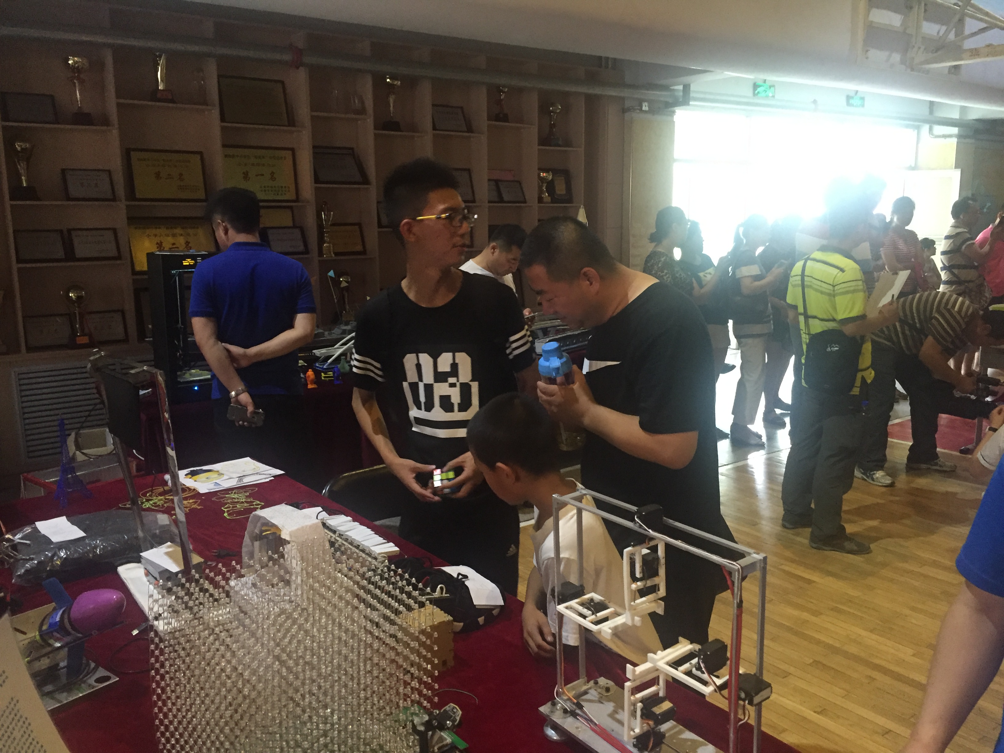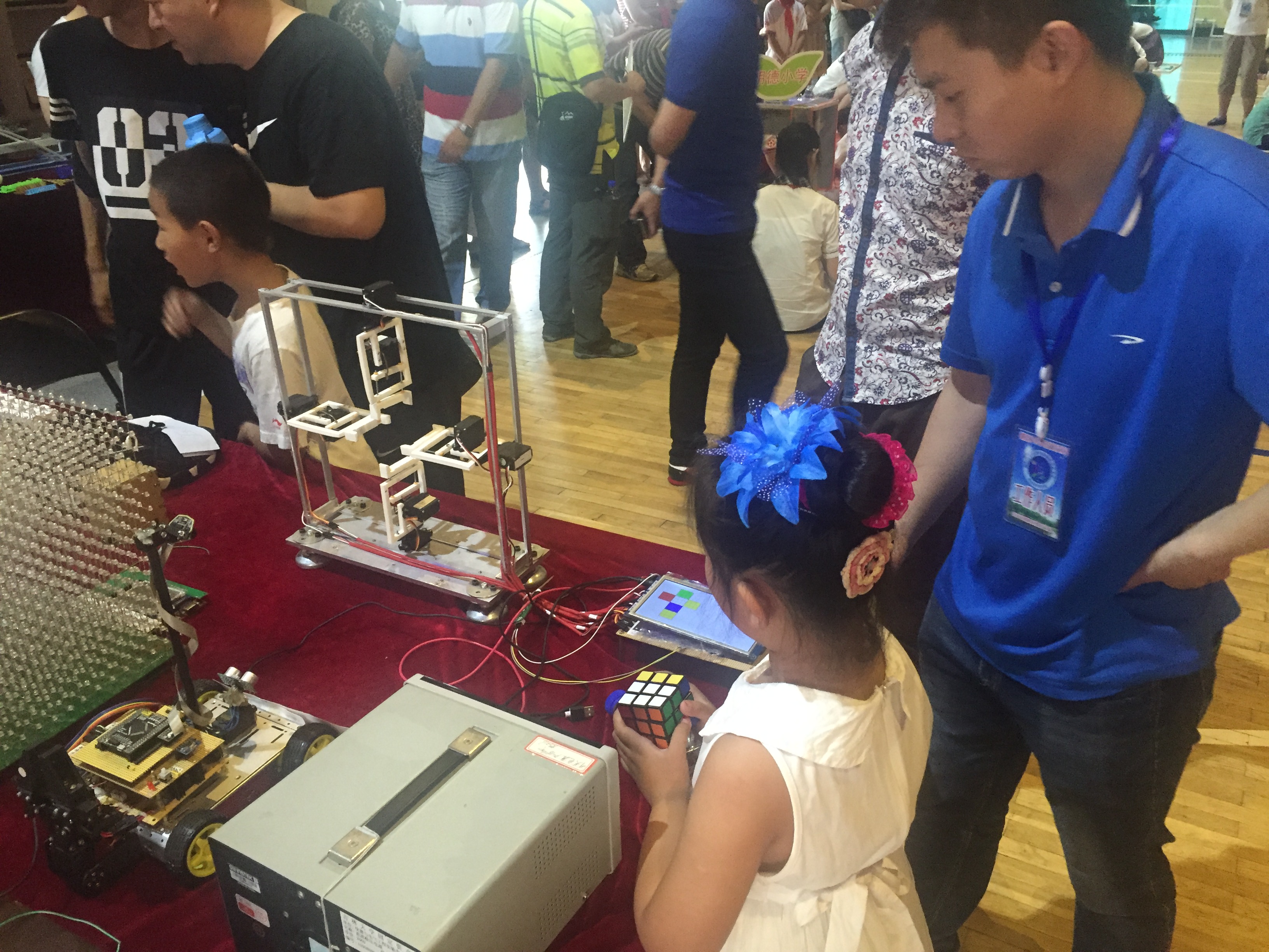 参加本次活动的主要领导有长春市朝阳区区政府领导、教育局领导等。本次出展的作品主要是科技创新团队的优秀作品,科技创新团队成员也由这些人组成。在科技作品展上,创新团队成员积极热心的为中小学生讲解自己手中的作品。讲解方式深入浅出通俗易懂,既符合中小学生的知识水平,又得到在场的不少专家的肯定和领导的满意,圆满的完成了作品展的任务。本次作品展,科技创新团队不仅担任了讲解员的任务,而且还扮演了知识科普的角色。因此,团队成员在介绍自己作品的同时也时不时的向参展学生提问,通过兴趣引导参展学生思考科学问题,之后通过正确的解释来指导学生。此外,展后科技创新团队还组织了交流互动环节,为在科技创新方面有浓厚兴趣的中小学生答疑解惑,现场气氛轻松活跃,时时伴有欢声笑语,孩子们的知识也让不少团队成员吃惊。感叹中国当代中小学生的优秀和学校的认真负责。