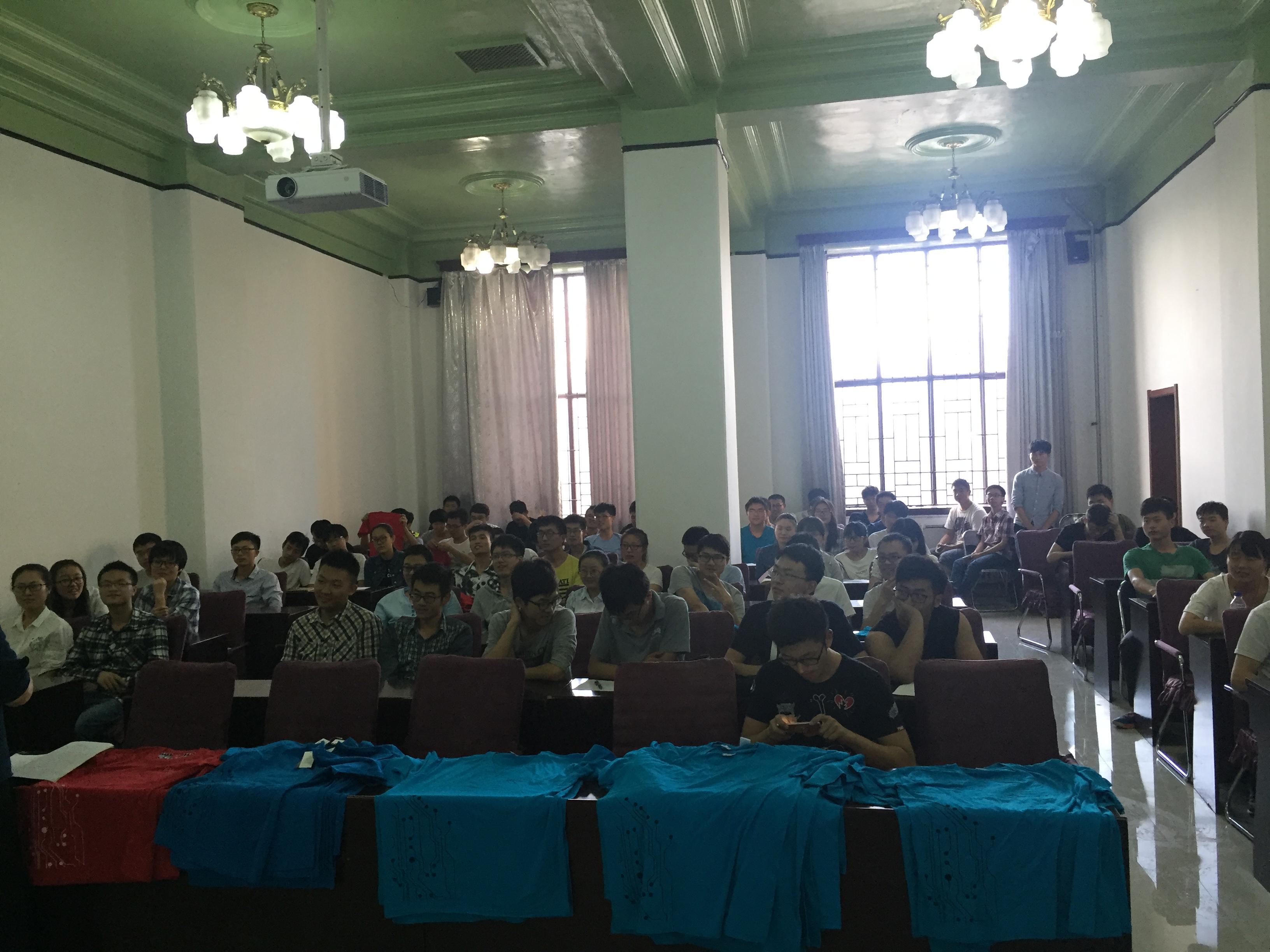 动员大会由院实验中心副主任、科技创新团队指导教师千承辉老师主持。会议伊始,邱增凯老师向全体同学贯彻了习近平总书记的系列重要讲话精神以及校团委关于三下乡活动指导思想,强调了本次专业社会实践活动的时效性,切忌走马观花。同时邱增凯老师对参加本次活动同学们的热情给予了充分的肯定,他指出专业实践技能以及专业创新一直是广大青年学生所欠缺的,希望同学们可以珍惜这短短65天的实践活动,认真按时的完成学院科技创新团队所下达的任务,将理论与实践完美的结合,学院党委和实验中心会尽最大的努力为大家提供所需的物质资源和精神食粮,做同学们坚实的后盾。邱老师又强调了本次活动期间的用电安全等问题,并各位参加培训的同学都能有所收获。随后千承辉老师向各位同学大致介绍了各年级同学的实践任务,并结合自己多年的实践指导经验指出了同学们在实践和创新方面的欠缺同时也为大家提出了一些珍贵的建议,让同学们少走弯路,所有同学获益匪浅。最后邱增凯老师和千承辉老师为同学们分发了队服以资鼓励。