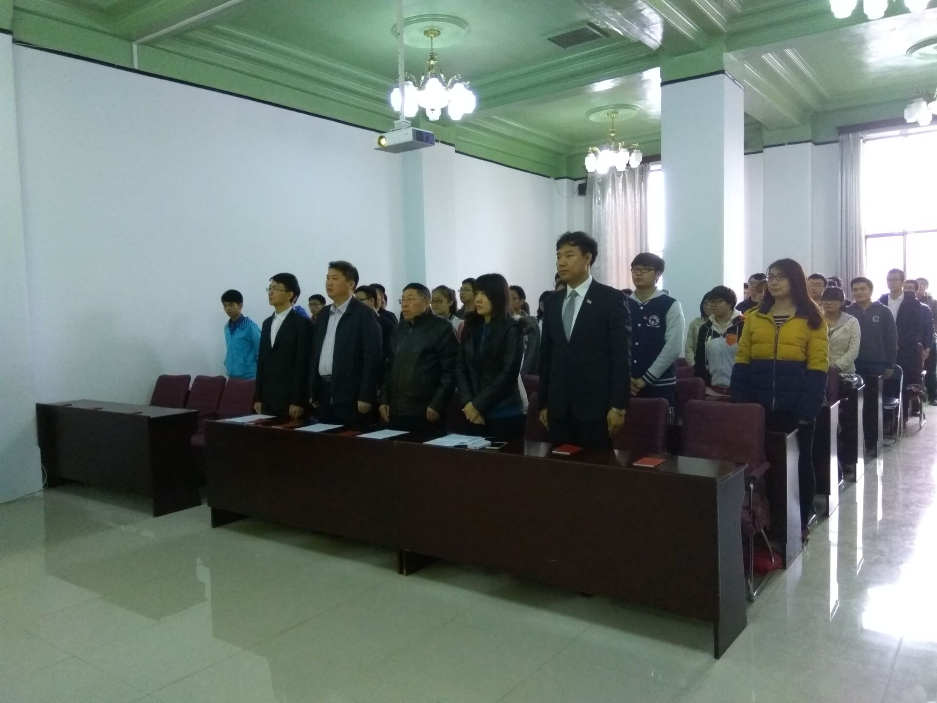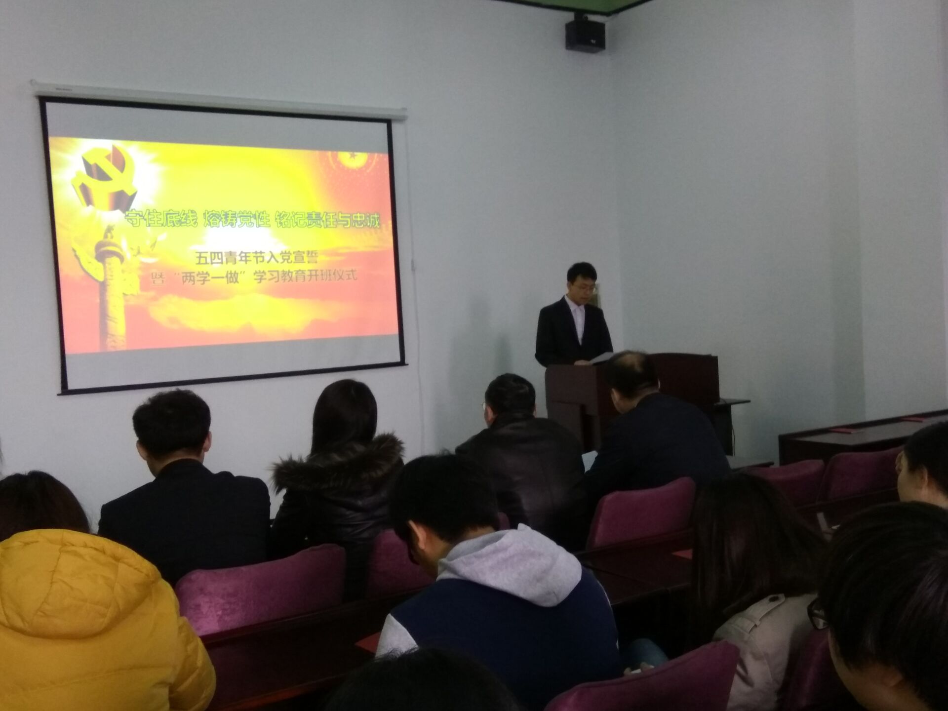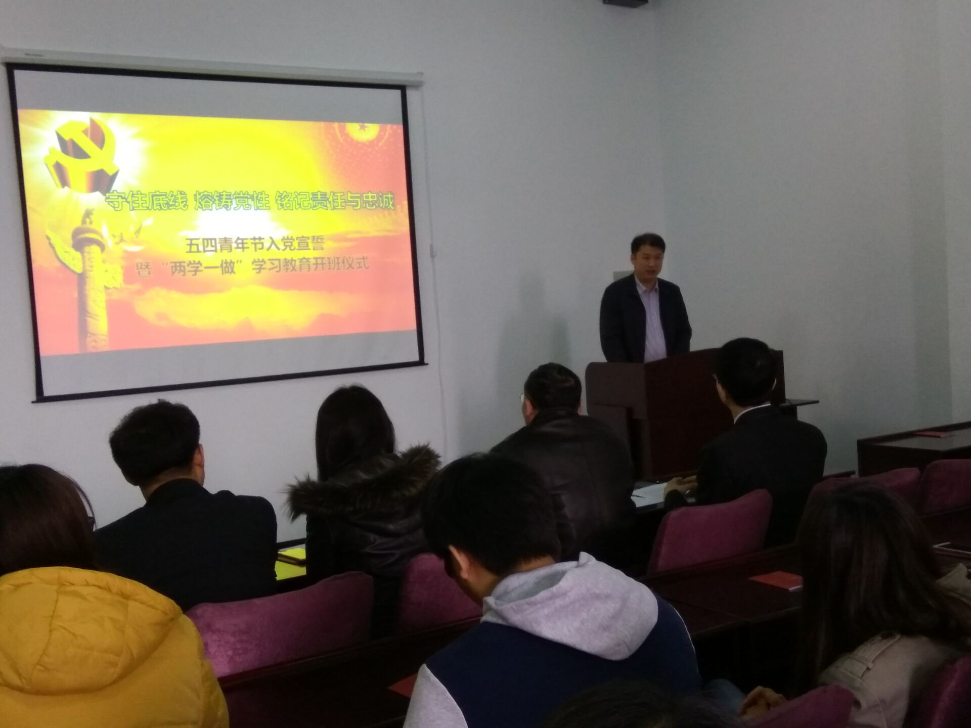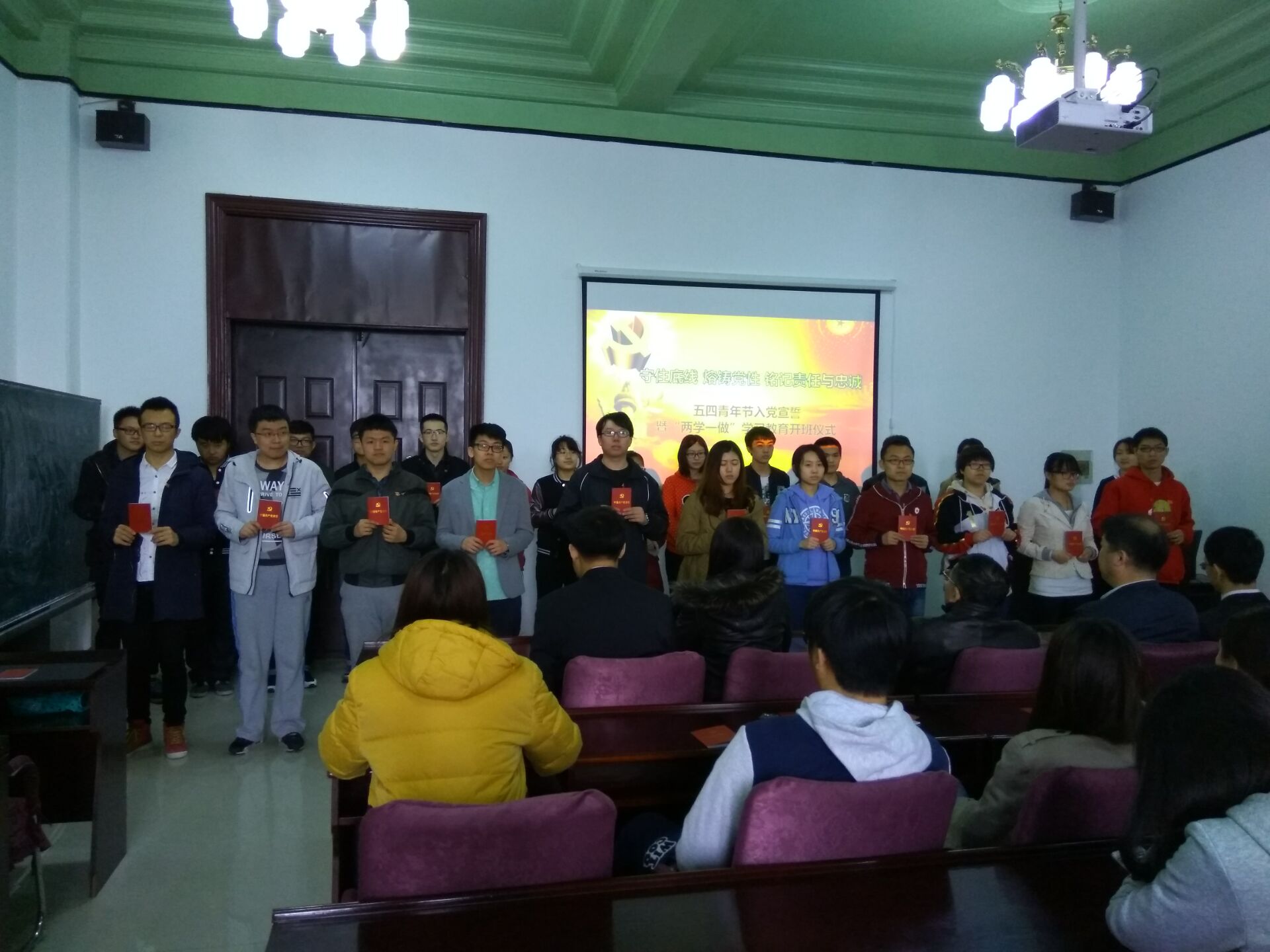 为弘扬五四爱国精神,坚定广大学生党员的理想信念,部署“两学一做”相关工作,A片网站 本科生党支部于2016年5月4日12:30在朝阳校区地质宫208室举行了五四青年入党宣誓暨“两学一做”学习教育开班仪式,学院党委书记余国友教授、党委副书记兼副院长邱增凯老师、学生工作办公室主任王冕老师、本科生党支部全体党员和入党积极分子参加了本次会议。