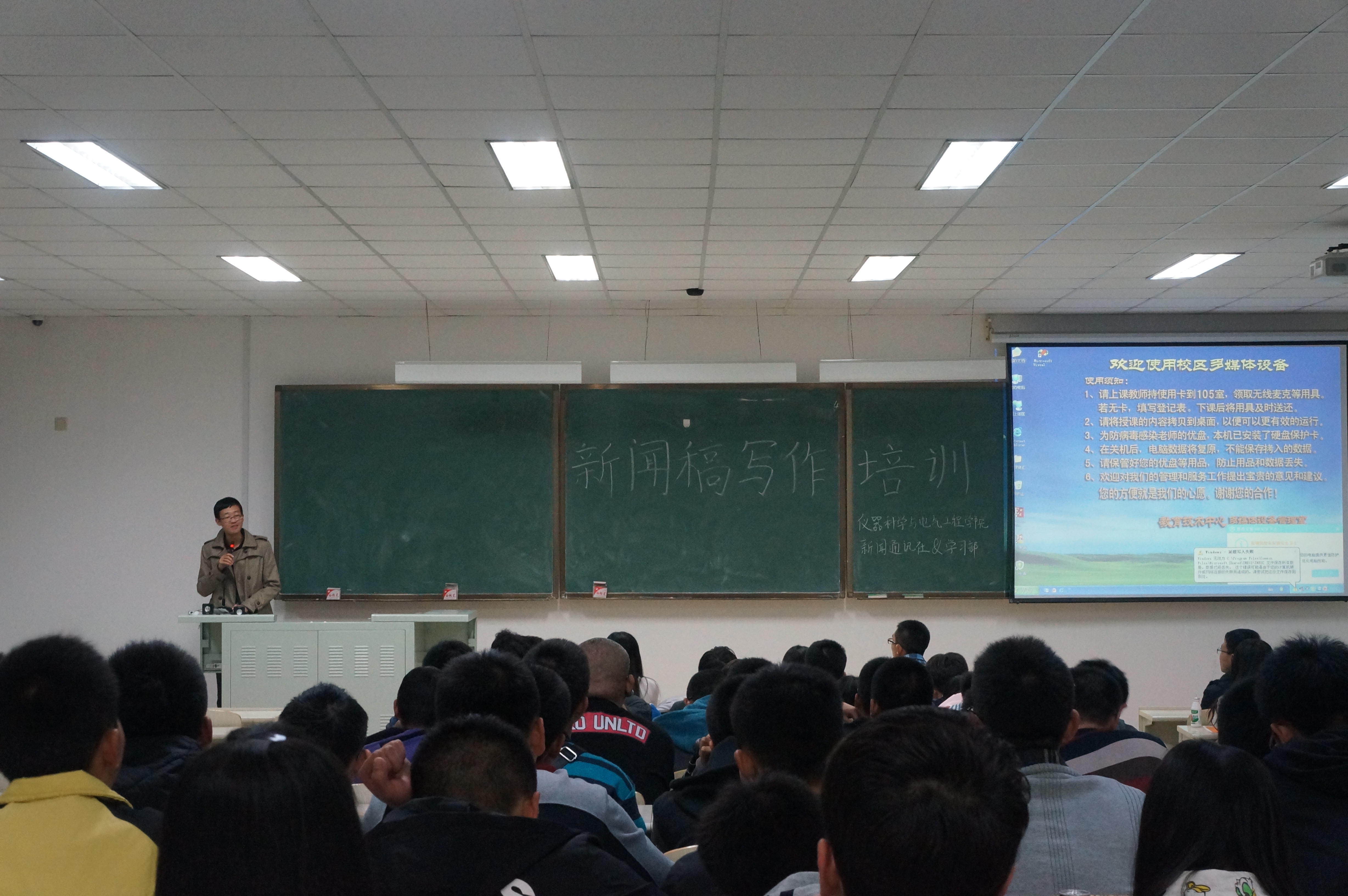 晚18:00整,新成员们准时来到李四光教学楼208室,培训活动很快拉开了序幕。活动开始,富有经验的新闻通讯社副社长陈乾向新成员们介绍了新闻稿写作的基本知识,包括新闻稿的五个结构,新闻稿的的格式要求,以及写作的多种技巧。新成员们认真仔细地边听边做着记录,并且还向学长学姐们积极地提出疑问;台上的学长学姐们生动幽默的讲解使现场的气氛温馨愉快。在现场浓厚的互动氛围中,新成员们与学长学姐积极地交流着写作的心得体会,培训活动在热烈的互动中渐渐落下帷幕。