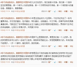 自5月8日开始,由班级团支书在本班团支部微博平台结合时事以及班级同学学习情况发表关于习近平总书记系列讲话的学习内容微博。同学们于5月8日-13日期间在本班团支部微博平台阅读学习,并发表微博讲述自己关于何为中国梦,当代大学生如何实现中国梦的看法与见解,以此作为理论学习的主题。过程中,同学们针对“为实现‘中国梦’,当代大学生应该做些什么?”这一问题展开论述,同学们积极发言,探讨当代大学生如何在中国特色社会主义道路上实现中国梦的理想信念,并积极思考自己的理想与追求。很多同学谈到,当代大学生不仅要学好科学文化知识,更要加强在道德、文化等方面的个人修养,弘扬五四精神,为实现中国梦贡献自己的一份力量。