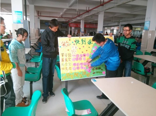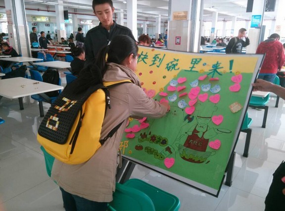 团委于2013年9月27日中午在中心校区各食堂开展了“微笑,快到碗里来”餐饮生活大调查活动,让莘莘学子在享受食堂美肴的同时广泛抒发自己的意见与建议。