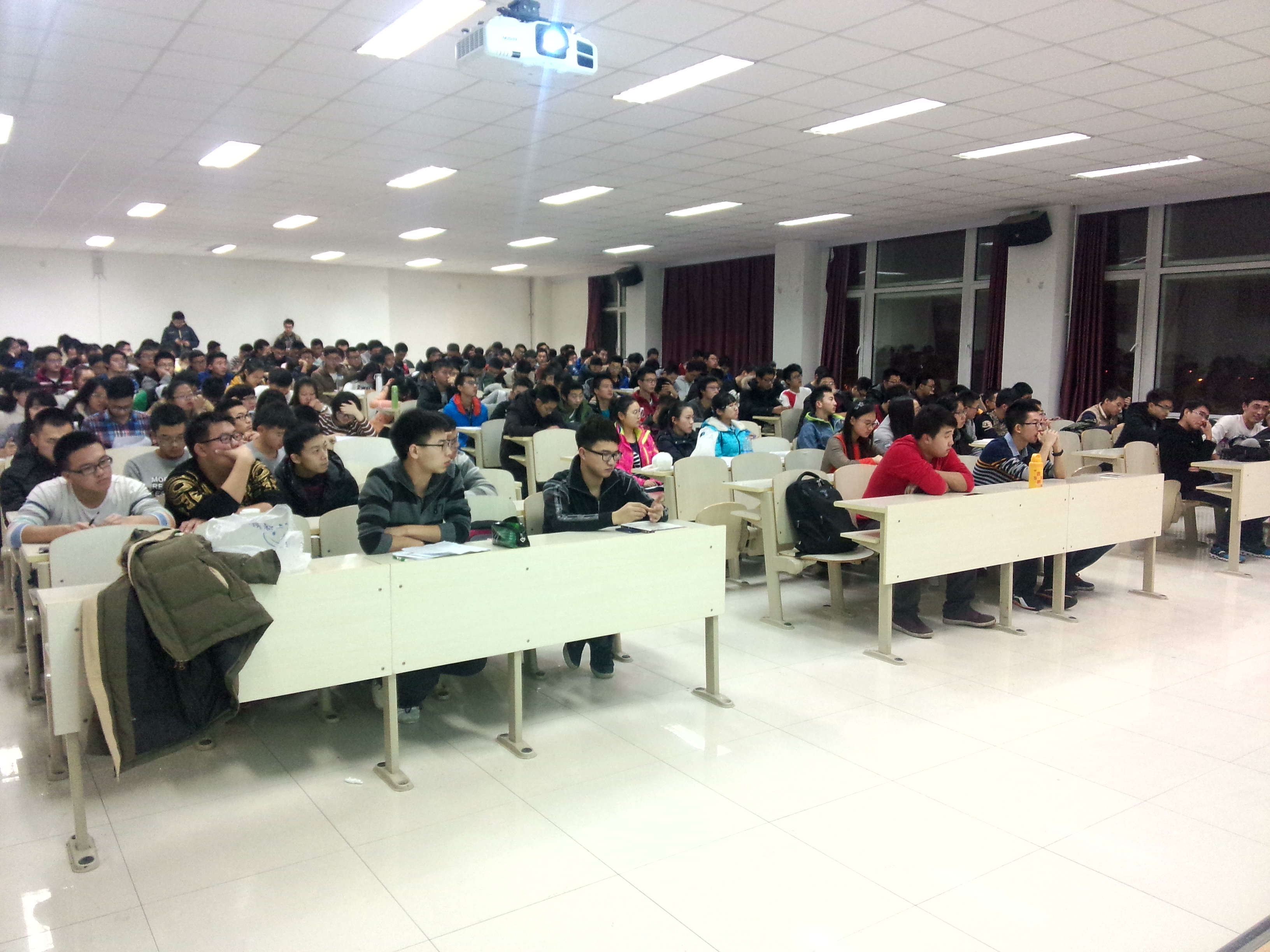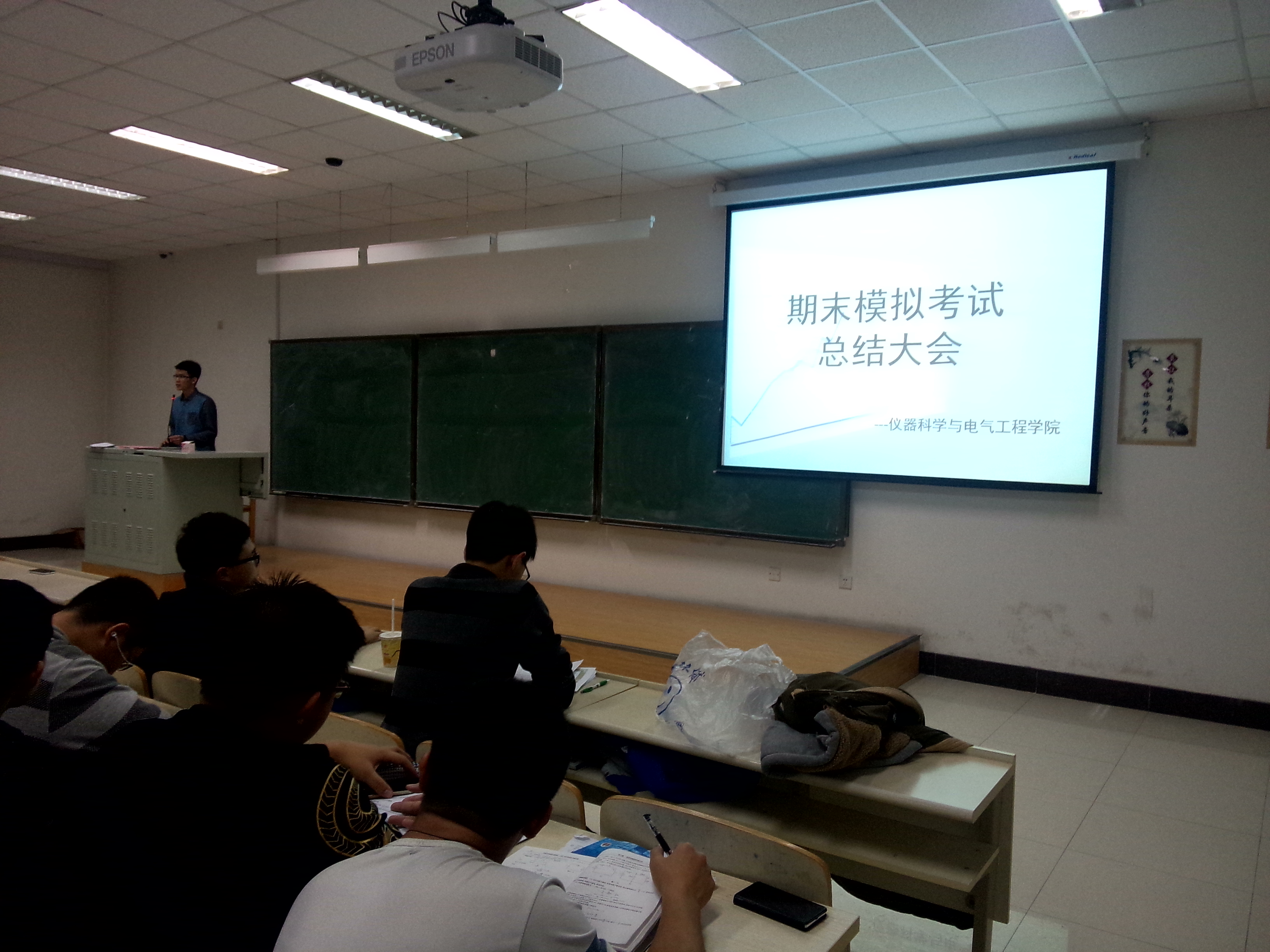 期末考试临近,为了让大一新生提前熟悉期末考试的一些基本的考场纪律,同时检验同学们在过去三个月中的学习情况,学习部于12月12日18:30在李四光308教室举办了期末模拟考试,并于12月20日晚18:30在李四光304教室举行了期末模拟考试总结大会。学生会主席岳良广,分团第一委副书记于一兵,学习部部长赵成及全体副部长,以及全体大一新生参加了此次总结大会。