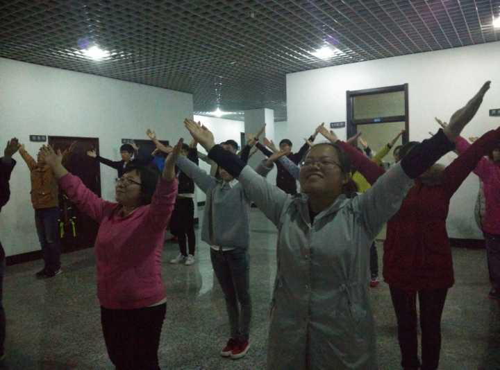2015级同学们在体育部学生干部的带领下于2016年4月6日在实验楼开始了健美操训练活动。
