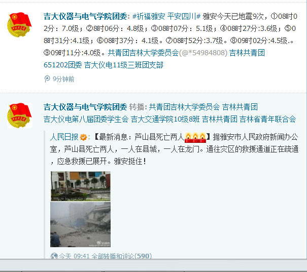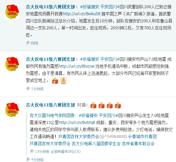 团委运用微博、人人网等新媒体工具第一时间向学院青年师生发布灾区信息,各班级团支部利用微博等关注灾情,广大青年学生在网络上第一时间向四川雅安地震灾区传递祝福。