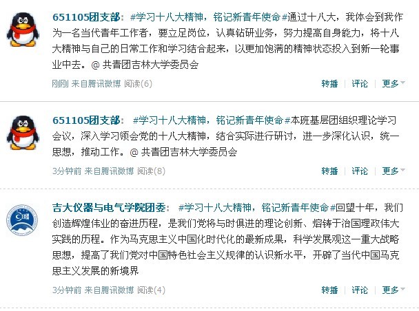 团委组织开展了“与信仰对话,喜迎十八大”系列主题活动之千班万团微博学议十八大活动,充分利用新媒体渠道,积极主动掀起学习宣传贯彻十八大精神的新高潮。