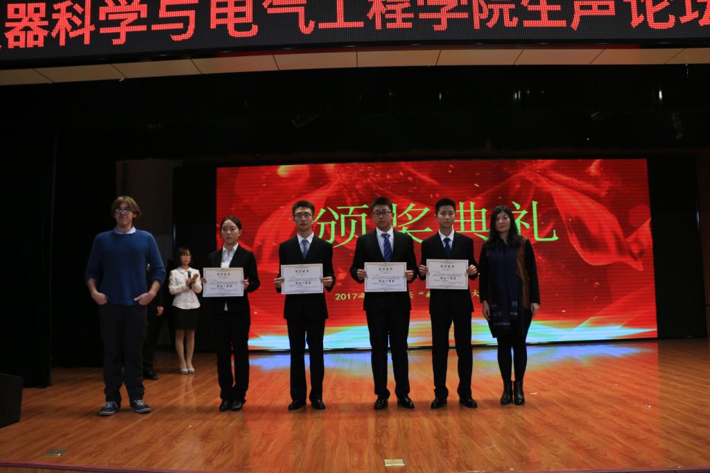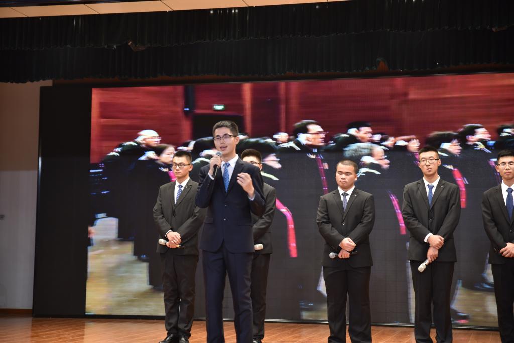 在此次汇报演出过程中六位社员用演讲脱口秀的方式进行了“不忘初心,回望十九大”专题演讲,表达了自己对十九大的看法与理解。演讲开始后,首先由主持人崔天成同学对十九大的背景进行了简要的介绍,2017级的陈宇峰与林晨希、郜泽霖与郭永甲、仲维一与刘熠三组同学分别选择了国防实力与教育、中国社会主要矛盾转变前后变化、“一带一路”外交发展三个话题、共六个方面向在场观众展现了十九大报告中所传达的成果与指导方针。演讲同学用风趣的语言和生动的比喻、事例向我们阐述了十九大的内容。现场同学们认真听取演讲并对中国在五年以来的发展与变革有了更深刻的认识。而演讲同学联系生活的部分更使同学们感同身受并多次爆发出热烈的掌声。随后,马克思主义学院副教授王成老师对整个活动进行了点评,对活动的举办表示肯定并对六位同学的表现给予了赞扬,最终由公共外语教育学院杨梅老师和Alex Cerola老师为演讲同学颁奖。
