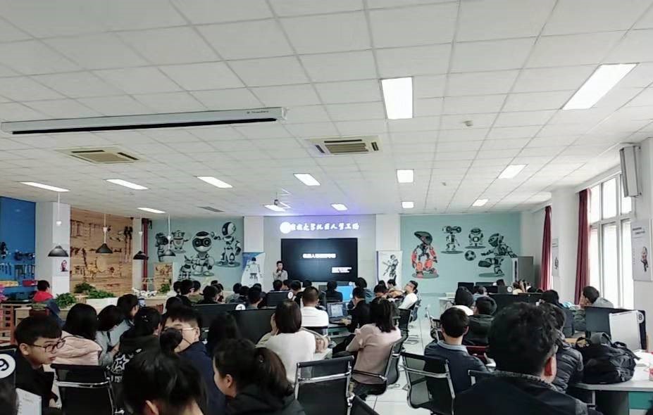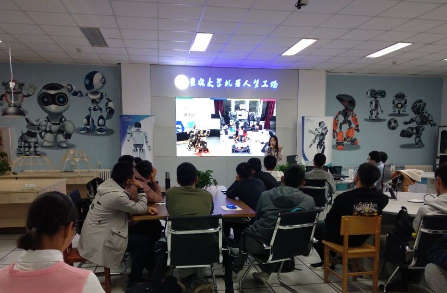 培训活动伴随着两台UBTECH机器人的开场舞正式开始。在简单介绍之后,滕泽远同学首先对武术擂台赛机器人设计目的和设计原理进行详细讲解,使同学们对比赛内容有了一定了解,接着带领同学们观看了小车对抗比赛的视频,激烈紧张的比赛让同学们对武术擂台赛机器人燃起浓厚兴趣,随后又带领同学们运用Luby Creater软件对机器人的代码进行设计,详细的讲解和现场操作引来同学们的阵阵掌声,将引导课的气氛推向高潮。高鑫宇同学接过话筒,首先风趣地讲解了人形机器人的结构,贴合人形机器人对抗赛的比赛规则,一一讲述了各个部件的作用以及比赛时的战略部署和调试技巧,接着对人形机器人各项赛事进行详细介绍,着重强调了比赛规则和得分方法,在比较容易出现疑问的部分,高鑫宇同学以视频介绍的方式带领同学们一起思考,加深了大家对比赛的理解,使同学们收获匪浅。随后惠乾鑫同学走上讲台进行总结,提出幽默诙谐的问题与大家进行交流,大家各抒己见,通过交流,他对同学们的想法表示强烈支持,并且依据自己多年的比赛经历,向同学们提供很多珍贵的实战经验,同学们对他的耐心指导也都谨记在心,另一方面他着重强调了比赛时的心态,良好的心态决定着比赛时的正常发挥,而且要拒绝畏难情绪,出现问题就要去解决问题,结果的好坏并不重要,重要的是在比赛中学到经验和知识,同样的问题下次遇到便迎刃而解了。