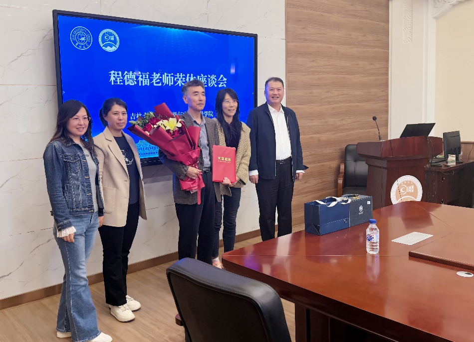 最后,邱增凯、林婷婷代表学院向程德福教授颁发荣休证书和纪念品,教职工代表为程德福教授献上鲜花,全体参会人员共同合影留念,座谈会在温馨愉快的氛围中圆满结束。