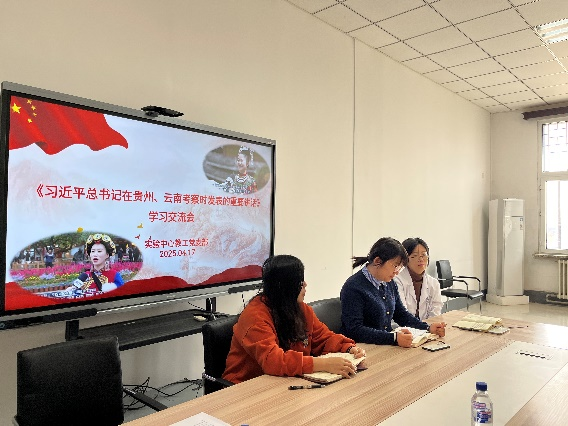 2025年4月17日,实验中心党支部全体党员开展“学习习近平总书记在云南、贵州调研考察时就深入贯彻中央八项规定精神学习教育发表的重要讲话精神交流会”,从讲话中汲取前进力量。同时,集中学习《习近平关于加强党的作风建设论述摘编》,以优良作风凝心聚力、干事创业。